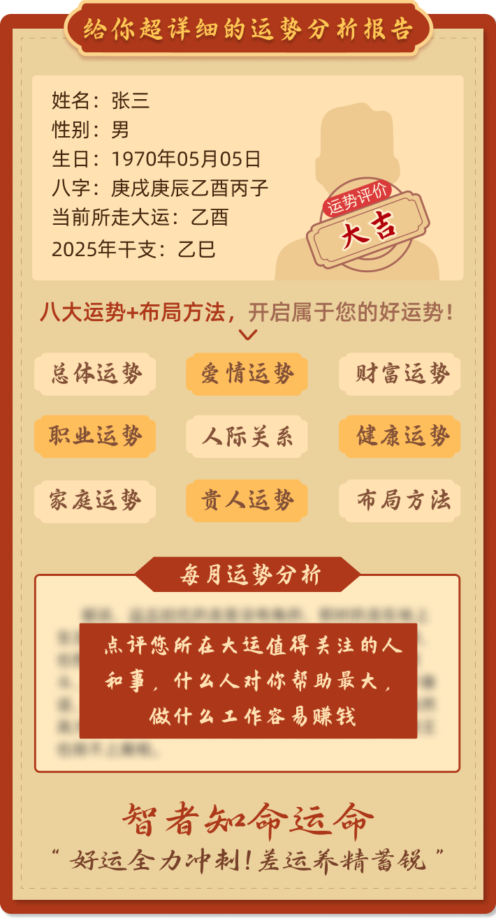 2、在您体验测算服务时,我们需要获取您的姓名和生辰命格 (出生日期),为了保证数据准确性,我们建议您提供真实的个人信息,若您提供的信息有错误,会对测算结果的准确性造成偏差。我们保证您的所有个人信息除了用于生成测算数据以外,不会用于其他用途。